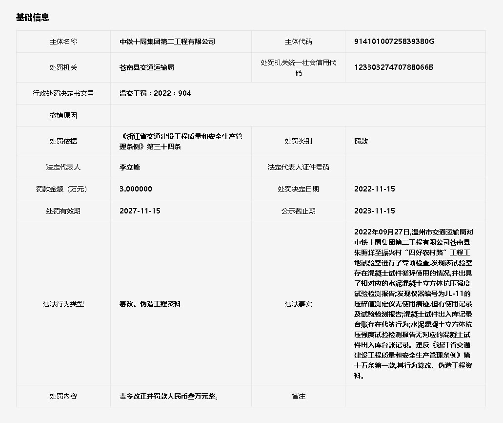 篡改、伪造工程资料 中铁十局集团第二工程有限公司被罚款3万元