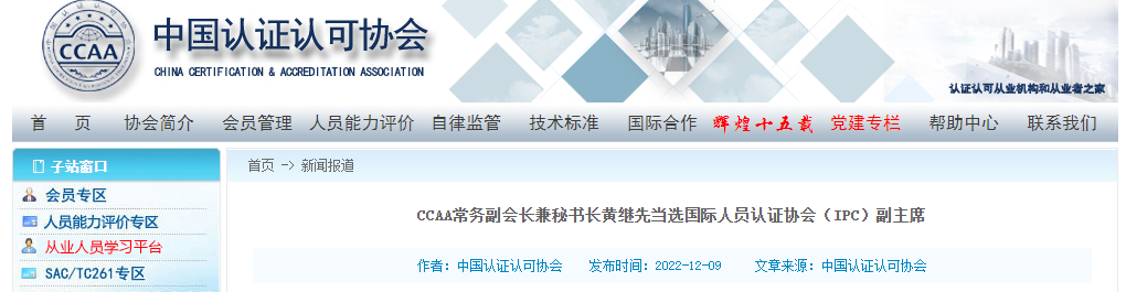 CCAA常务副会长兼秘书长黄继先当选国际人员认证协会(IPC)副主席