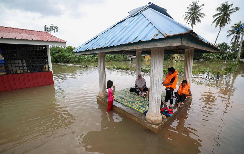 当地时间2022年12月21日,马来西亚吉兰丹州帕西尔马斯,一个家庭坐在被洪水包围的凉棚里。