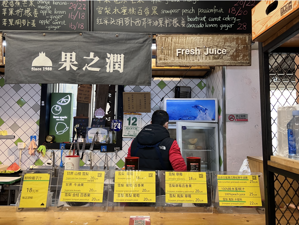然而由于果汁产品的独特性,无法加热食用,因而在春夏最受欢迎。随着上海入冬,门店生意清冷了许多,周传财苦笑说如今一天卖出的果汁加上外卖也不过十多单。