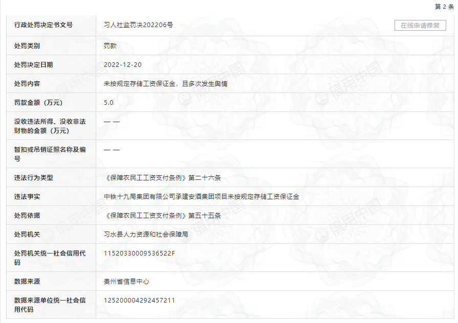 处罚文书号:习人社监罚决202206号显示,2022年12月20日,中铁十九局集团有限公司承建安酒集团项目未按规定存储工资保证金,且多次发生舆情。该行为违反了《保障农民工工资支付条例》第二十六条,习水县人力资源和社会保障局依据《保障农民工工资支付条例》第五十五条,对中铁十九局集团有限公司罚款5万元。