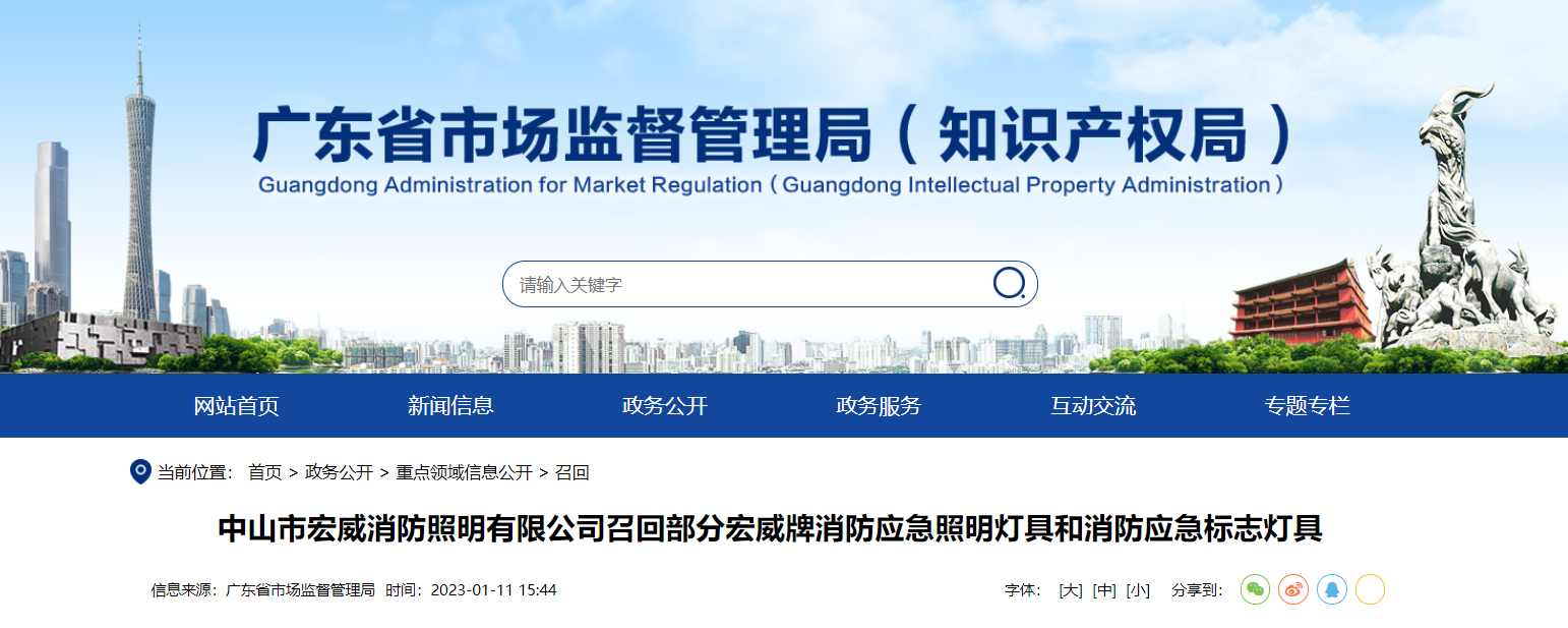 中山市宏威消防照明有限公司召回部分宏威牌消防应急照明灯具和消防应急标志灯具
