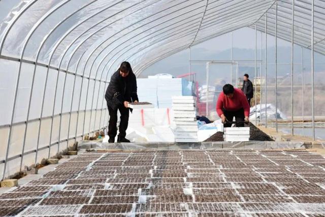 随着气温升高,贵州省福泉市农户开展辣椒集中育苗作业,气象部门派出技术人员指导农户抢抓晴朗天气科学育苗。图为罗贝村村民在大棚里摆放育苗盘 图/易盛武