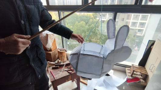 只见薛其华手拿竹刀,将新鲜的篾竹劈开,然后将竹篾剖成粗细均匀的篾条,再弯曲成圆,用扎丝捆扎成兔子的身体、脑袋、耳朵,这样兔子灯的框架就初步形成了。接着就是糊纸,由于每一块立面都必须单独裱糊,这就需要不停地调整角度,非常考验耐心。