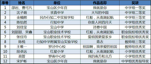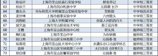在四项赛事中,通过上海市及全国专业评选,宝山区共8人获国家级奖项,101人获市级奖项。现将获奖名单公布如下,祝贺各位获奖选手和单位!