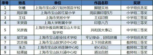 2022第四届“印记中国”师生篆刻大赛上海赛区获奖名单(宝山区)