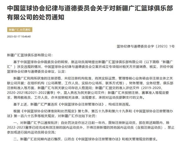 一、对新疆广汇予以通报批评;自处罚决定作出之日起一年内,限制注册新运动员,即在前述期限内,除2022-2023赛季已经完成有效注册的国内运动员外,不得注册新增的其他国内运动员(含预注册运动员),禁止参加或进行国内运动员转会交流;二、新疆广汇在同期内进行整改,以符合《中国篮球协会注册管理办法》和相关管理规定的要求。