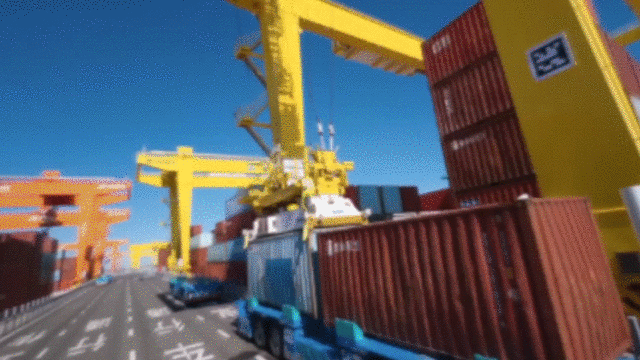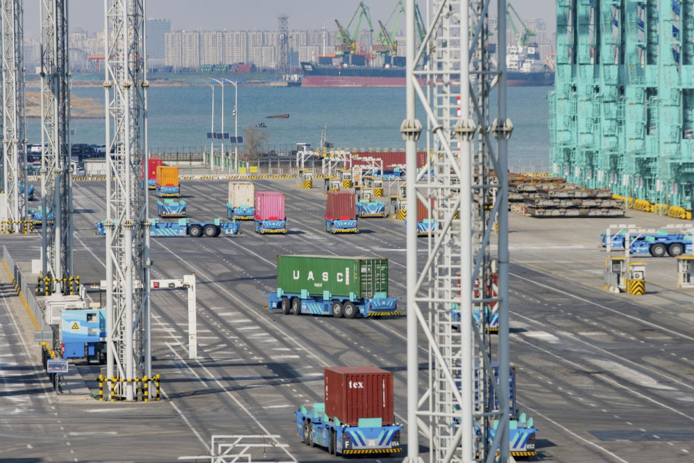 智能水平运输机器人在天津港全物联网集装箱码头作业(2月21日摄)。