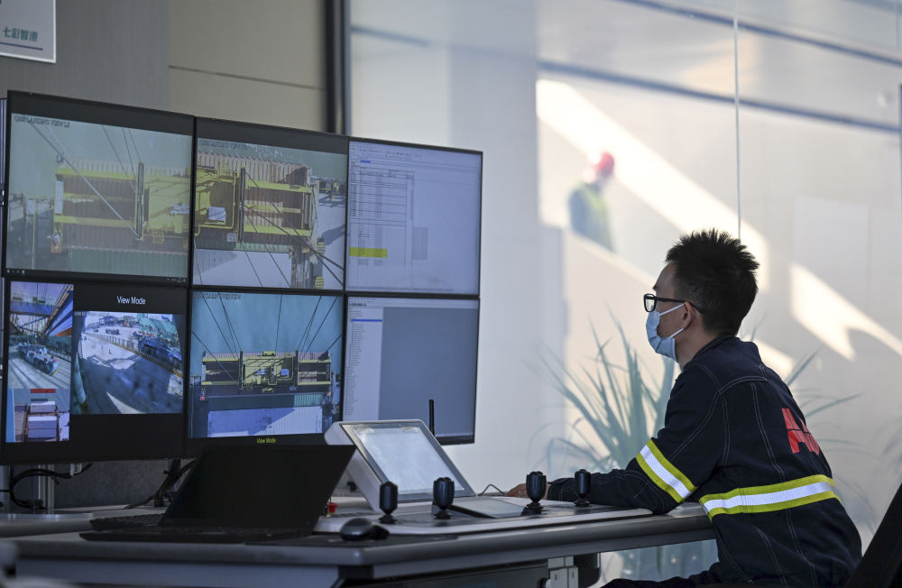 在天津港全物联网集装箱码头智控中心,工作人员远程操控码头机械设备(2月21日摄)。