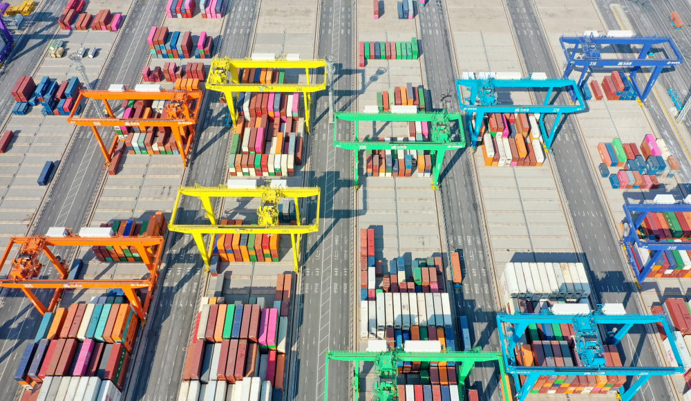 在天津港全物联网集装箱码头,场桥在堆场内吊运集装箱(无人机照片,2月21日摄)。