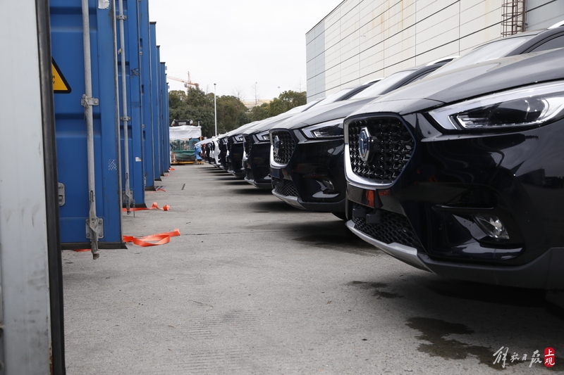 中远海运上海临港集运物流场站内,大批新下线待出口的上汽名爵新能源汽车集结而来,它们将被装入集装箱内,发往欧洲等海外市场。