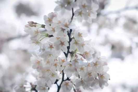 染井吉野樱初开时为淡粉,全开时为雪白。花开时满树繁花如云似霞,花谢时浪漫绝美。