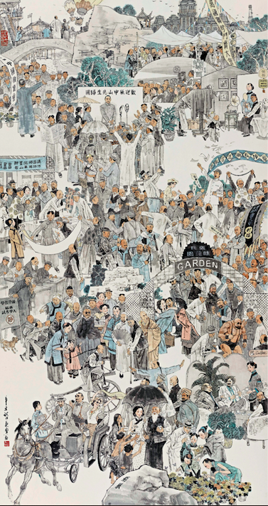 津门大侠霍元甲在张园大摆擂台,专会各国大力士;不远处是号召剪掉长辫子的横幅,穿着中山装的同志正在发传单宣传,旁边身着长衫人士刚刚剪好辫子正拿起来欢呼。围观群众中有记者正举着相机拍摄。热闹人群的最左侧,身处闹市里居然还有一片区域开辟出来正进行“复旦公学首届入学考试”。《张氏味莼园》里人物各异,尽显市井百态。