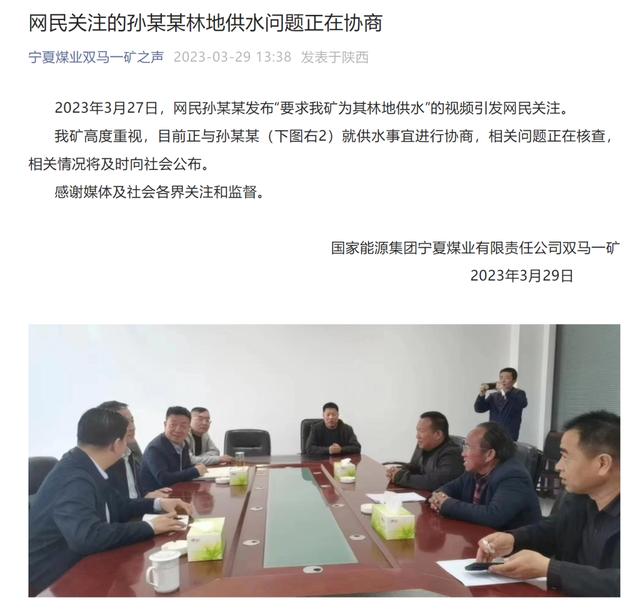 3月29日中午,涉事的宁夏煤业双马煤矿发文回应此事,称“网民关注的孙某某林地供水问题正在协商”。