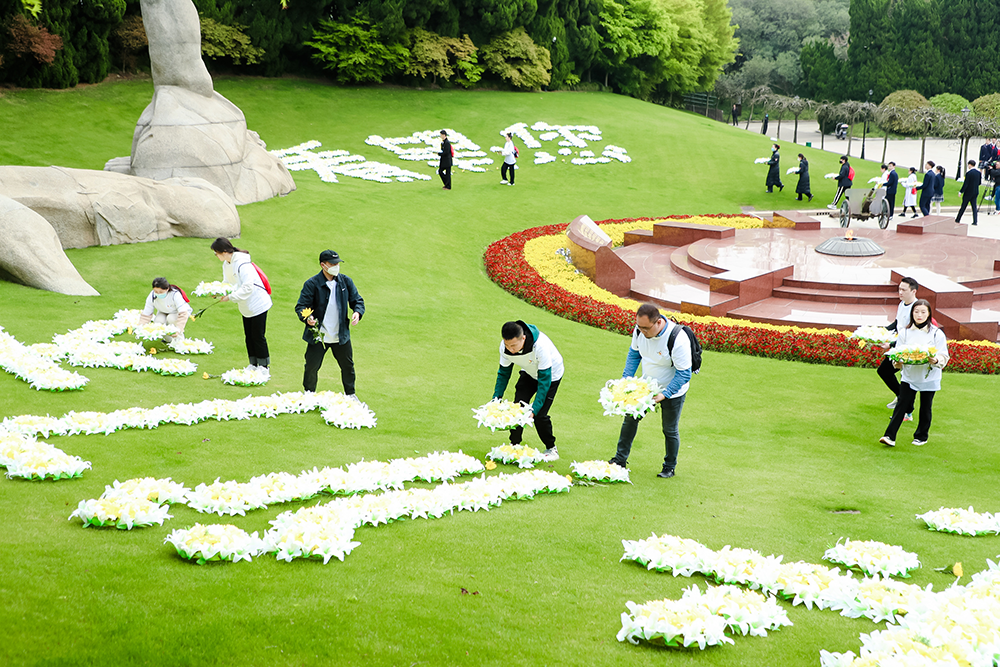 祭扫人群代表手持花盘,在无名烈士墓背后草坪上拼字“我们来看望您”。