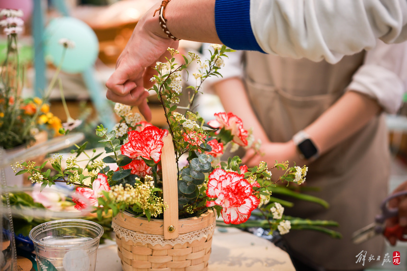 鲍雯洁是上海建设管理职业技术学院园林绿化专业三年级的学生,借着顾客等待成品的机会,她用五分钟的时间,潘沈涵老师一起手工完成了被老师评价为”层次分明、自然生长、韵律舒适“的花篮,谈到向消费者实战售卖自己作品的感受,她告诉记者:“枝条张扬、充满创意的花篮往往能受到消费者的青睐,理论与实践的结合,可以让我们把学校学到的专业与我们未来的就业相结合。”