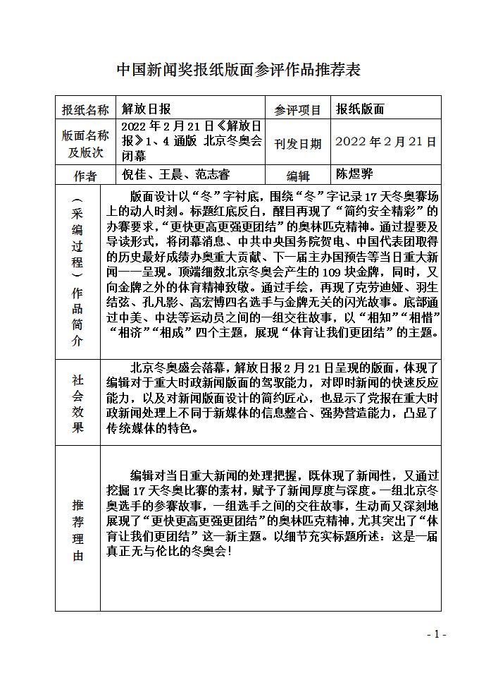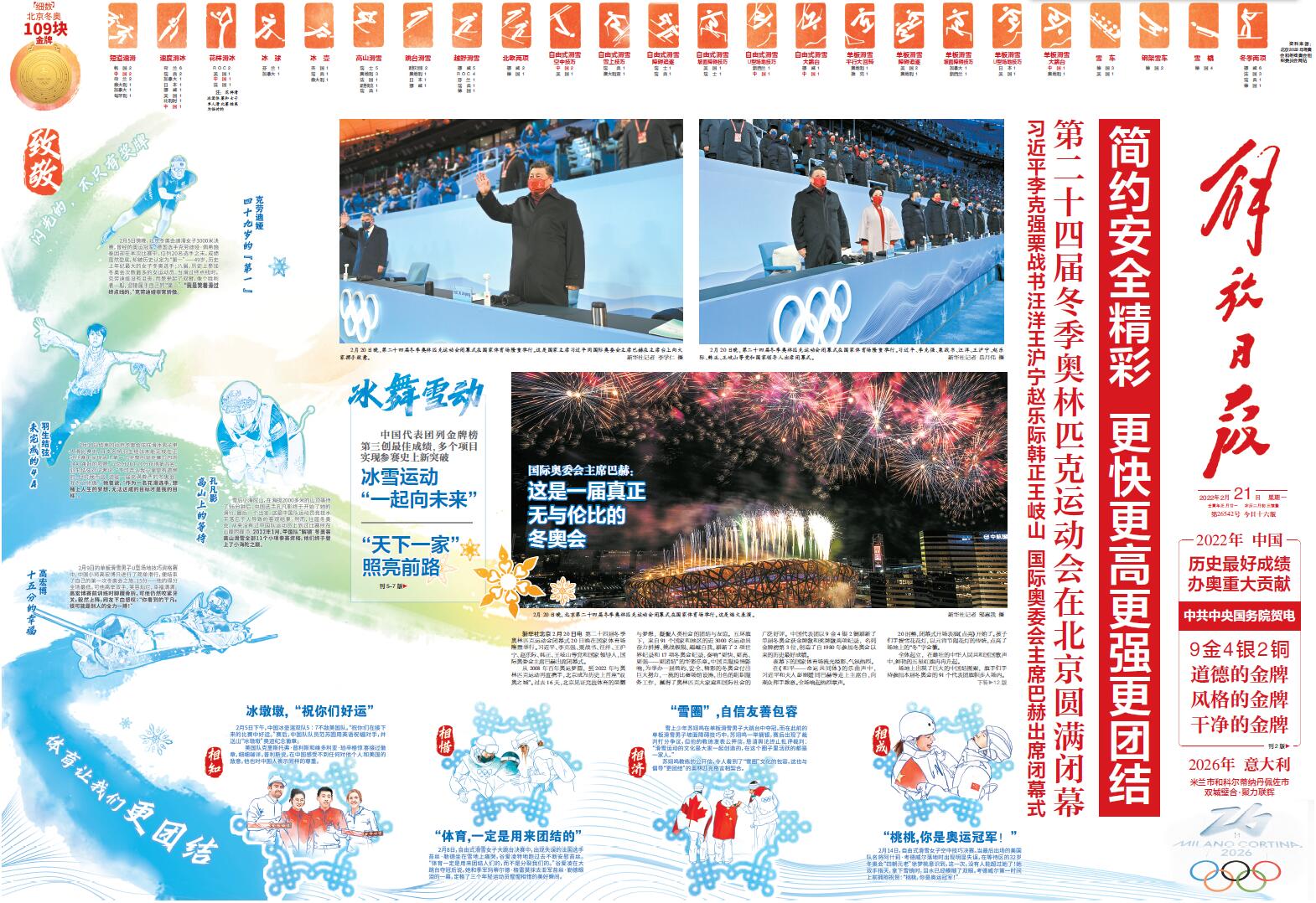 解放日报:1、4通版 北京冬奥会闭幕