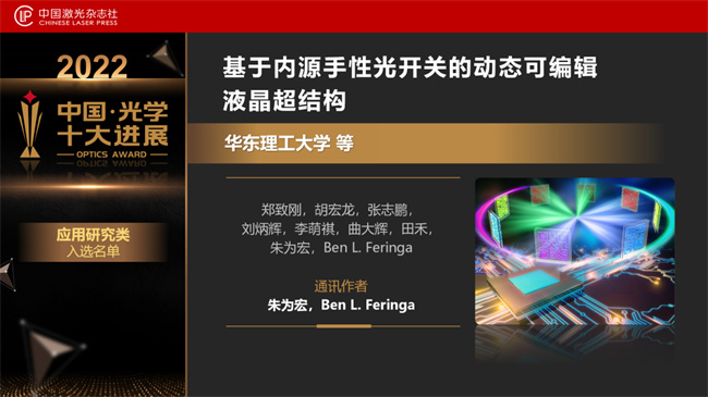 华东理工大学化学与分子工程学院、物理学院、费林加诺贝尔奖科学家联合研究中心朱为宏、郑致刚、Feringa合作,围绕动态可控手性液晶光学微结构,从材料设计、制备和微结构的外场控制入手,解决传统液晶体系光效率低的问题,赋能液晶微结构的光控宽动态域,发展可逆、可擦、渐变、结构叠加与嵌入的多重防伪新技术,为解决我国在高端防伪技术领域面临的材料瓶颈提供了可供借鉴的技术方案。