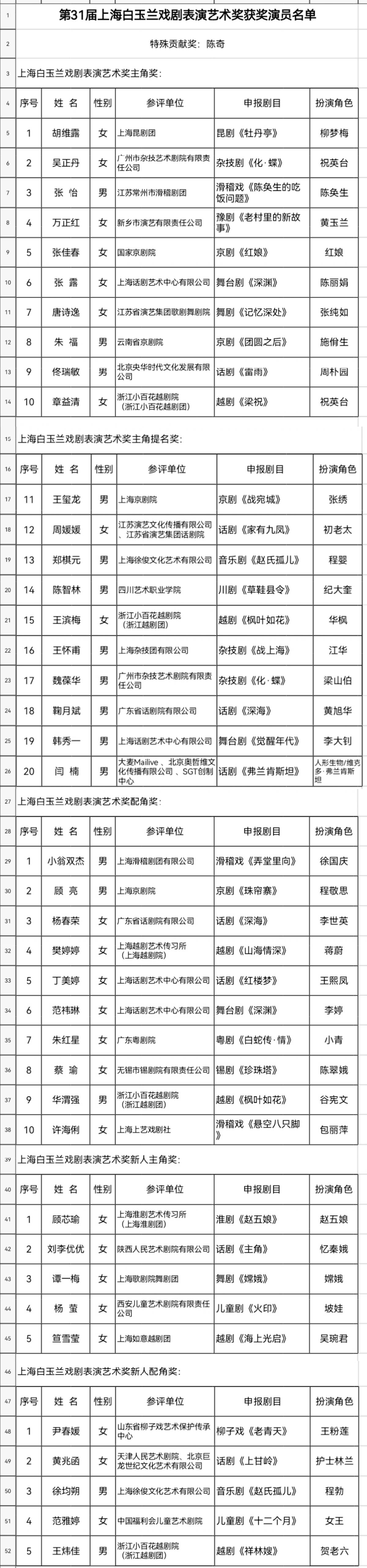4月21日晚,第31届上海白玉兰戏剧表演艺术奖颁奖晚会在上海文化广场举行,上海昆剧团胡维露凭借昆剧《牡丹亭》获得主角奖榜首,上海滑稽剧团有限公司小翁双杰凭借滑稽戏《弄堂里向》获得配角奖榜首,上海淮剧团顾芯瑜凭借淮剧《赵五娘》获得新人主角奖榜首,山东省柳子戏艺术保护传承中心尹春媛凭借柳子戏《老青天》获得新人配角奖榜首。