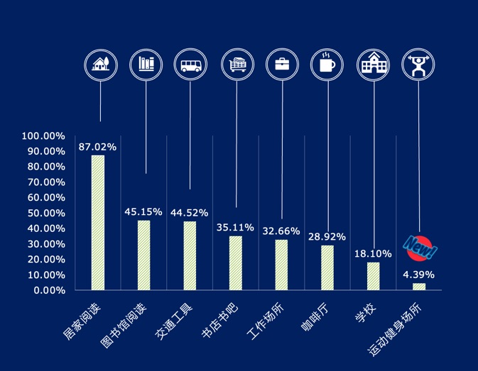 阅读行为在城市中随处可见,居家(87.02%)、图书馆(45.15%)、交通工具(地铁、公交、火车、飞机、私家车等)(44.52%)、书店(35.11%)是上海市民的主要阅读场所。此外,运动健身场所阅读成为上海市民阅读的新现象,有4.39%的上海市民有过此种阅读体验。