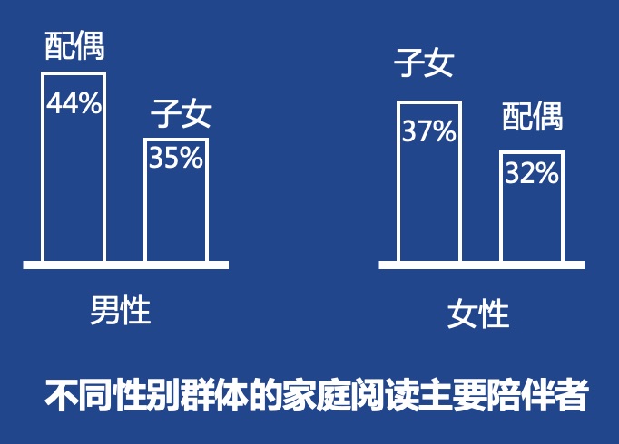 在所有有家庭阅读习惯的青年、中年受访者中,仅有8.31%选择了向上反哺型阅读作为最主要的家庭阅读模式,即选择了父母、祖父母为家庭阅读的最主要陪伴者;41.96%的青年、中年受访者认为自己家庭阅读最主要的陪伴者为子女;49.74%的青年、中年受访者选择同辈阅读,即选择和兄弟姐妹或者配偶为首要的家庭阅读陪伴对象。