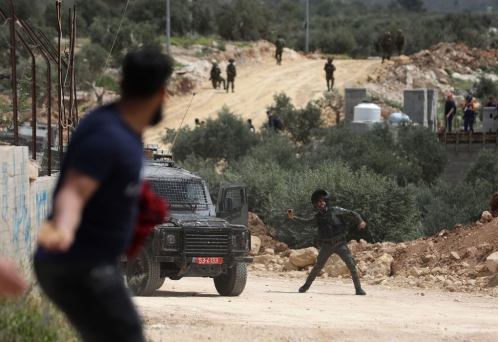 4月10日,在约旦河西岸城市纳布卢斯,一名以色列士兵投掷催泪弹。新华社发(艾曼·努巴尼摄)