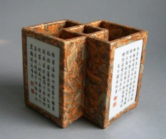 △乾隆御制诗文仿石釉双联笔筒北京艺术博物馆藏