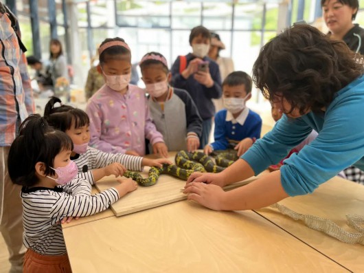 “这个蛇皮摸起来像塑料,闻起来有点臭臭的。”隔壁的自然教室内,孩子们一边听讲解员的介绍,一边观察,一边触摸,兴趣盎然。