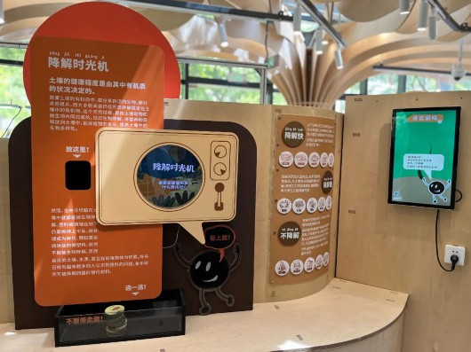 自然中心的室外部分也妙趣横生,分布有蜻蜓、松鼠和蛙类等多个景观小品及互动装置等,同时设置低碳堆肥区,为周边居民提供生物多样性科普知识。