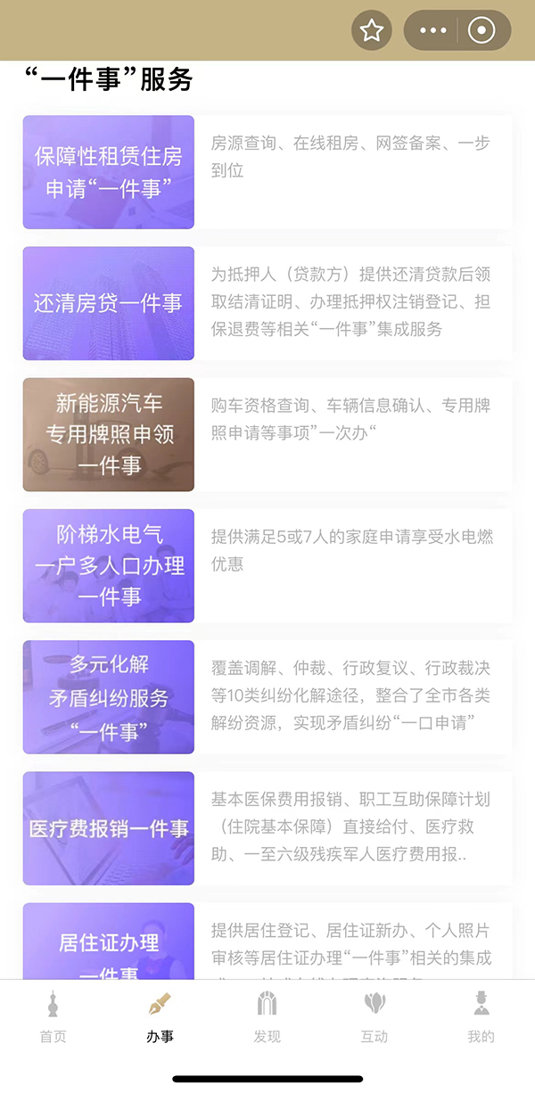 打开上海“随申办”APP或小程序,许多常办事务可通过“一件事”高效办理。“随申办”小程序办事栏目截图