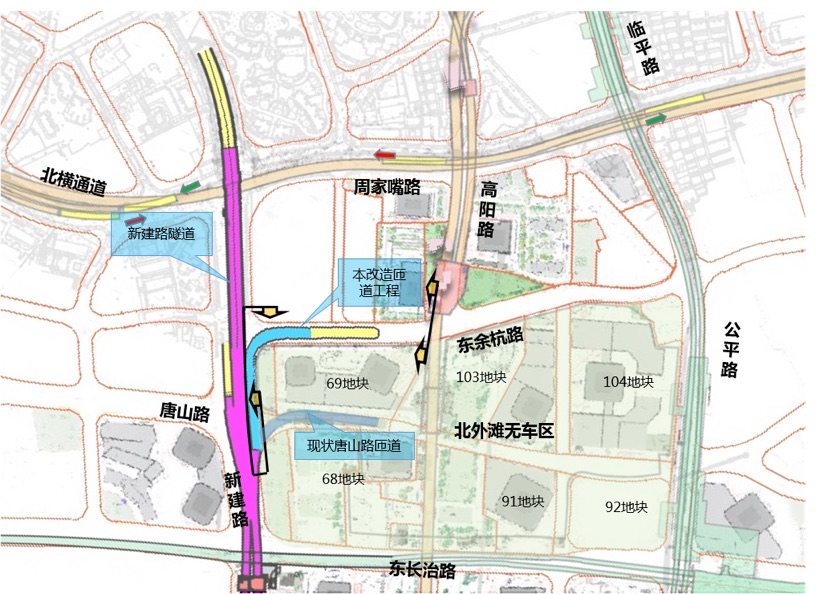 新建路隧道作为直接联系北外滩的一级出口,唐山路匝道改建后将有利于打造区域高品质慢行交通环境,提升北外滩核心区品质,更好地支持北外滩地区开发建设。