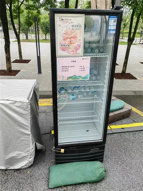 当日气温超过30度,感觉口渴的记者想找地方购买一瓶水。北出入口附近的滨江步道旁,恰好立着一台玻璃柜,在玻璃柜门上,贴着一张价格表,分别是雪糕、山泉水、盐汽水的价格。柜子里面摆放着三层“延中牌饮用天然泉水”。记者想买一瓶,可附近却没有工作人员,再仔细一看,柜门也已经被一把带着锈迹的铜锁锁住了,似乎已空置很久,不再提供服务了,记者只好放弃。
