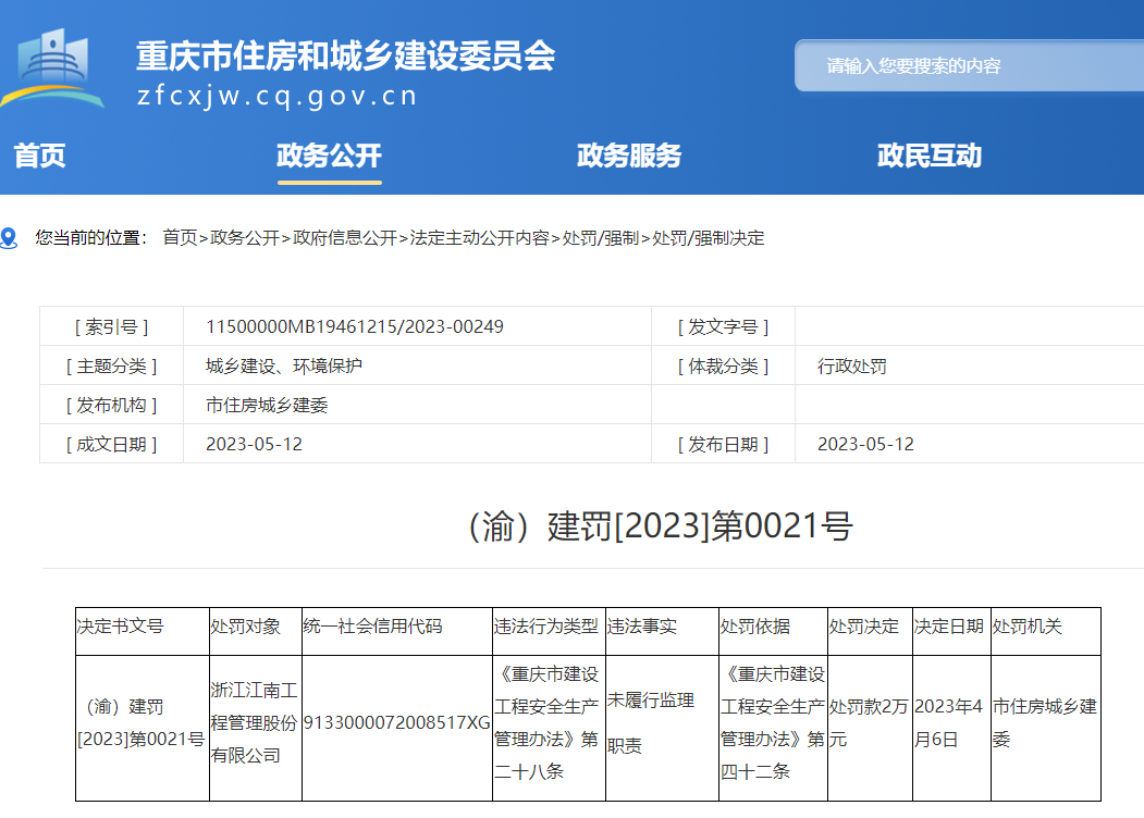(渝)建罚[2023]第0021号信息显示,浙江江南工程管理股份有限公司未履行监理职责,违反了《重庆市建设工程安全生产管理办法》第二十八条。重庆市住房城乡建委依据《重庆市建设工程安全生产管理办法》第四十二条之规定,对浙江江南工程管理股份有限公司罚款2万元。