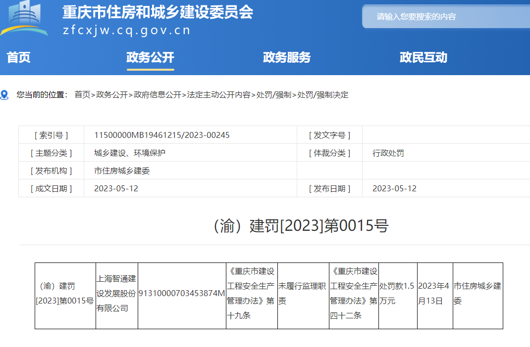 (渝)建罚[2023]第0015号信息显示,上海智通建设发展股份有限公司未履行监理职责,违反了《重庆市建设工程安全生产管理办法》第十九条。重庆市住房城乡建委依据《重庆市建设工程安全生产管理办法》第四十二条之规定,对上海智通建设发展股份有限公司罚款1.5万元。