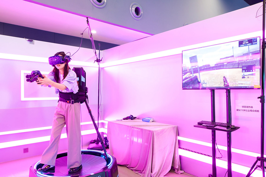 在展厅内,观众可以站上立体的“VR跑步机”,握着手柄感受“荒漠打靶”的紧张与刺激。还可以坐在充满科技感的座椅上左右摇晃,进入《无主之城》的穿越世界,还能钻进圆形星球的360全景影院,在懒人沙发上感受《阿尔卑斯》的“极限攀岩”。