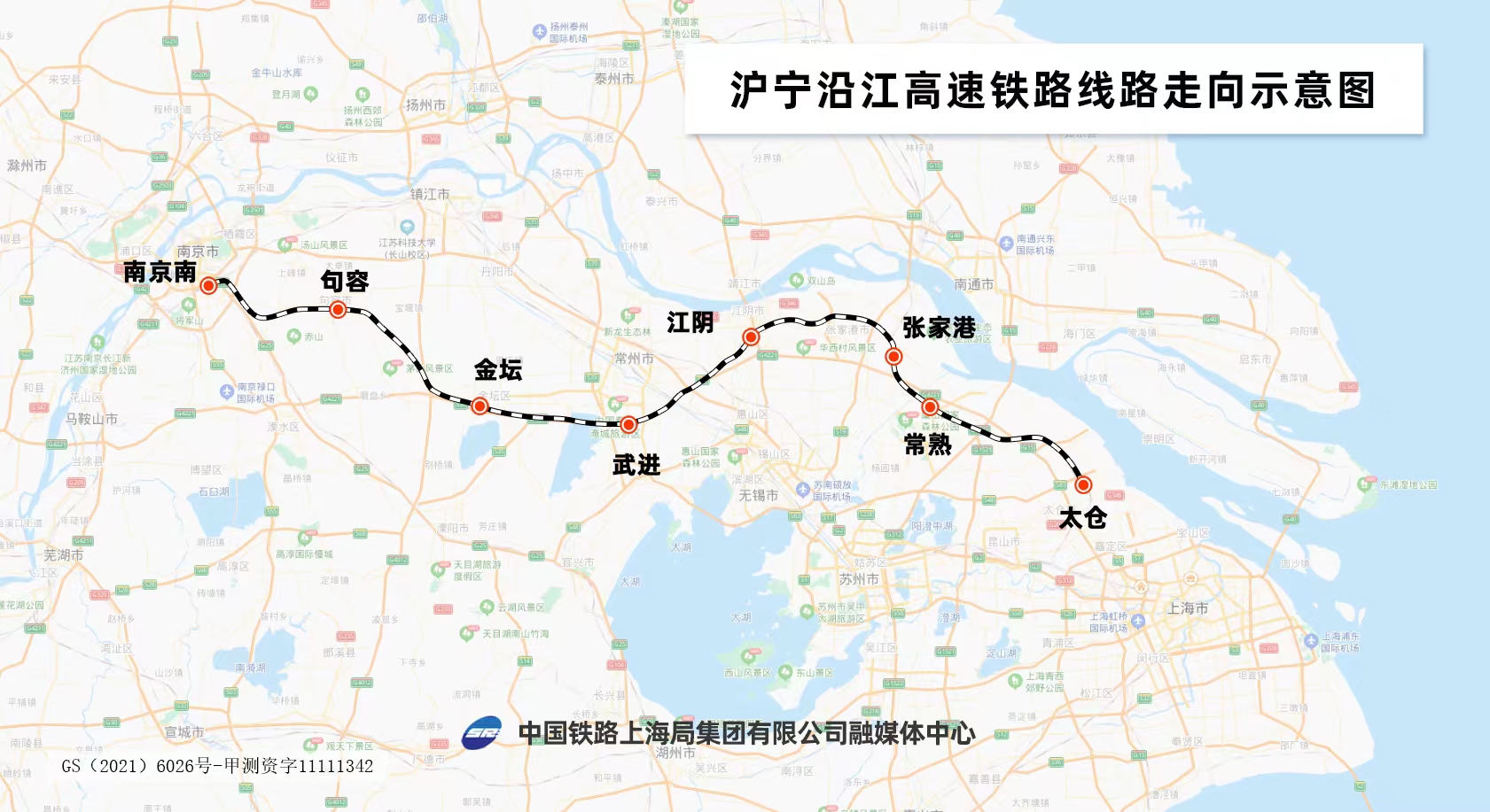 沪宁沿江高铁起自南京南站,经南京市、镇江市、常州市、无锡市、苏州市,至太仓站,通过沪苏通铁路接入上海铁路枢纽,线路全长279公里,设计时速350公里。全线共设南京南、句容、金坛、武进、江阴、张家港、常熟、太仓8座车站,其中南京南、张家港、常熟、太仓站为既有车站,句容、金坛、武进、江阴站为新建车站。