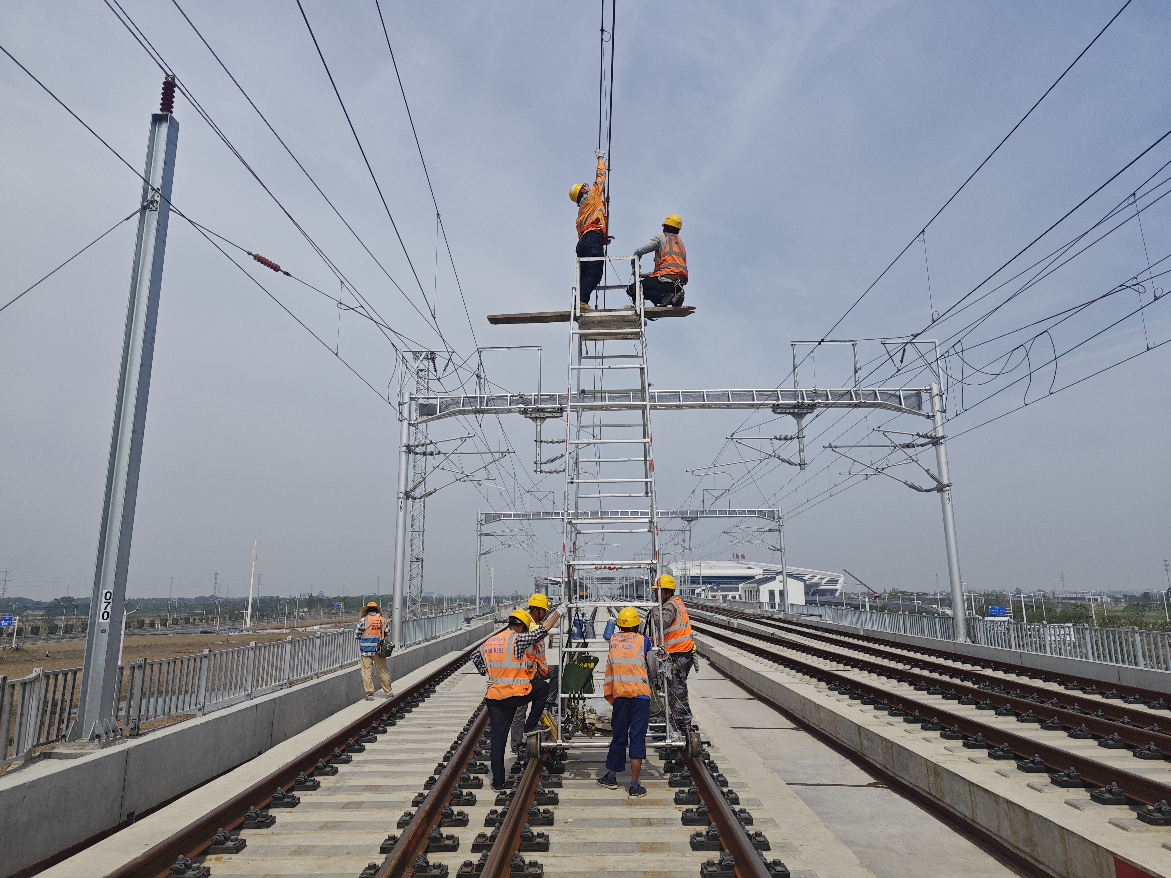 南京供电段工作人员对金坛站接触网设备进行检修。