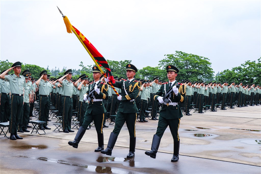 授衔仪式正式开始,礼兵迈着整齐的步伐,擎举着武警部队旗从队伍面前走过,官兵整齐列队、气宇轩昂,高唱《中国人民解放军军歌》。