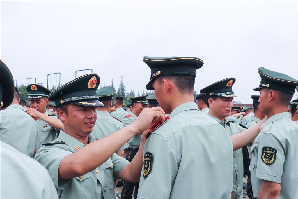 授衔即是受命,宣誓即是出征。宣读完授衔命令后,新训干部骨干为新兵们佩戴上崭新的武警列兵警衔。这是每名军人在军旅生涯中的重要时刻,意味着他们从一名地方社会青年正式转变合格军人,标志着他们的军旅征程从此刻正式启航。