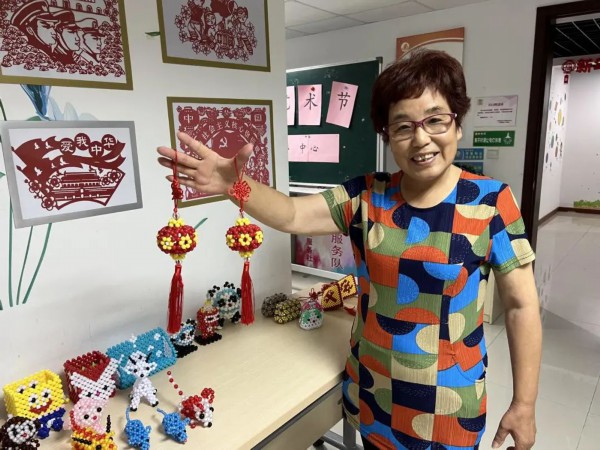 串珠作品是艺术节上闪亮的“明星作品”。阿姨们介绍,每一个串珠作品,都是大家一颗珠子一颗珠子串起来的,为了串出一匹骏马的造型,阿姨们必须先有骏马的立体三维构思,然后再按照串珠的技法,一步一步串出来。