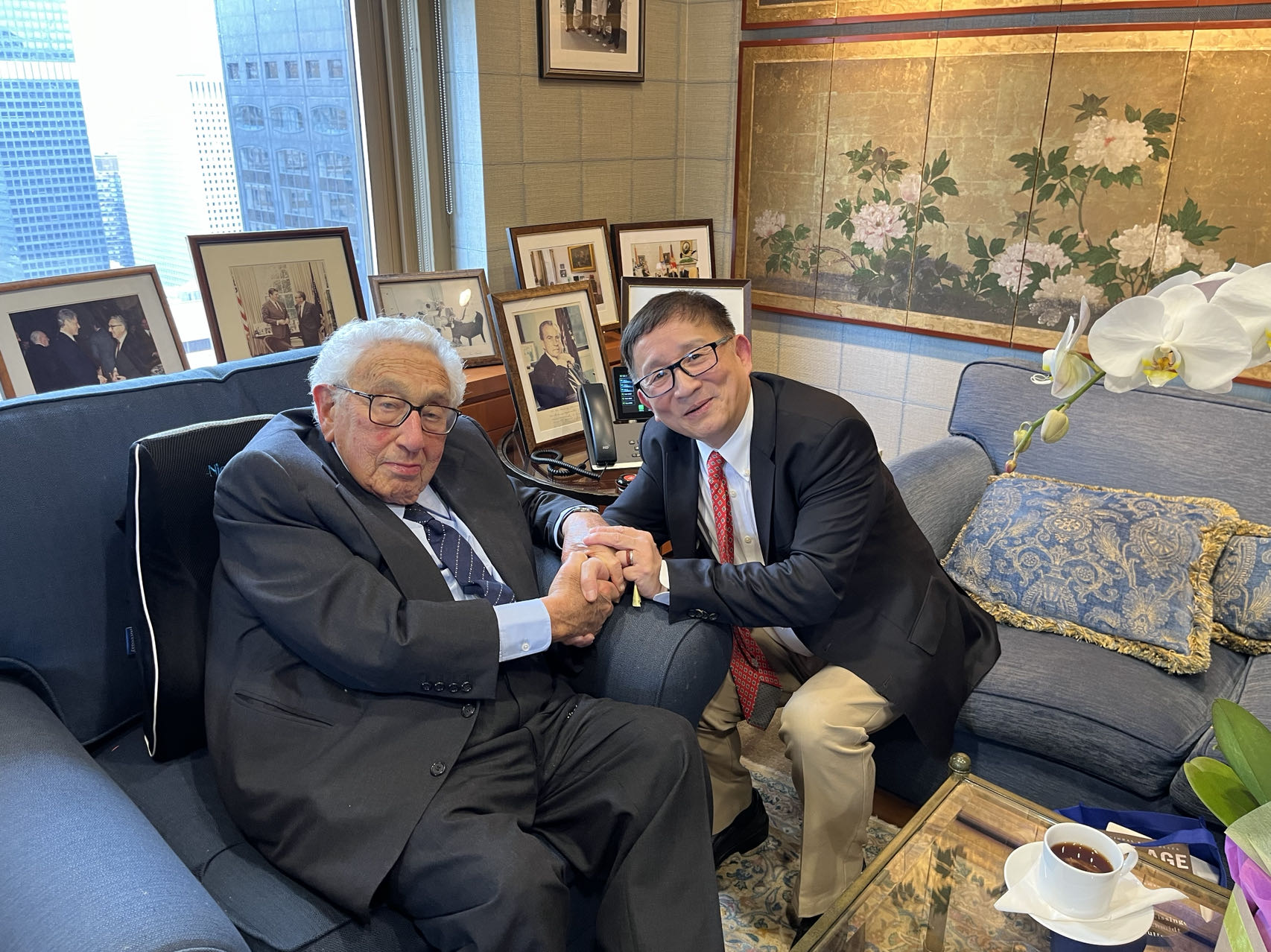 李成离开美国赴中国香港前,在纽约与其恩师基辛格道别致谢。 李成供图
