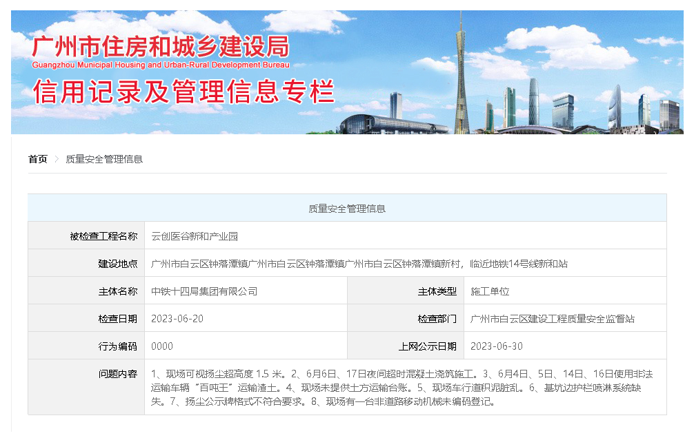 中国质量新闻网讯(高玉婷)近日,广州市住房和城乡建设局信用记录及管理信息专栏公示了云创医谷新和产业园项目的质量安全管理信息相关问题。