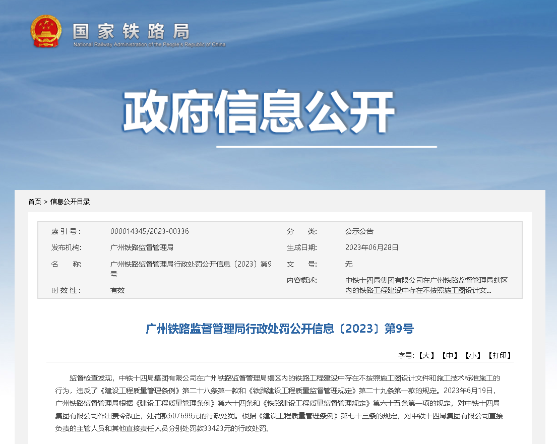 除此之外,作为施工单位的中铁十四局集团有限公司在广州铁路监督管理局辖区内的铁路工程建设中存在不按照施工图设计文件和施工技术标准施工的行为,被广州铁路监督管理局罚款人民币60.7699万元。