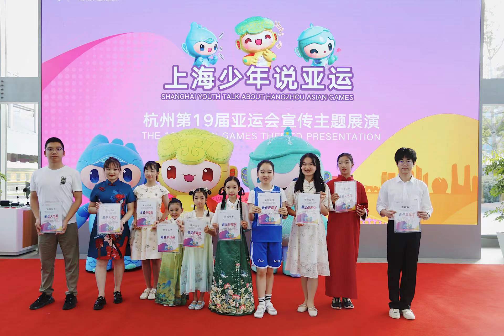 此次,在杭州亚运会迎来倒计时60天之际,在杭州市委宣传部、浙江省政府驻上海办事处和上海合作交流办共同指导和支持下,亚运宣传主题展演活动圆满举办。上海青少年以自己的视角去讲述“心中的亚运吉祥物故事”、共唱《同爱同在》亚运推广曲,传递更多的亚运好声音,旨在让更多的人参与其中,感受到体育赛事的独特魅力,为即将举办的亚运盛会献上美好的祝福。