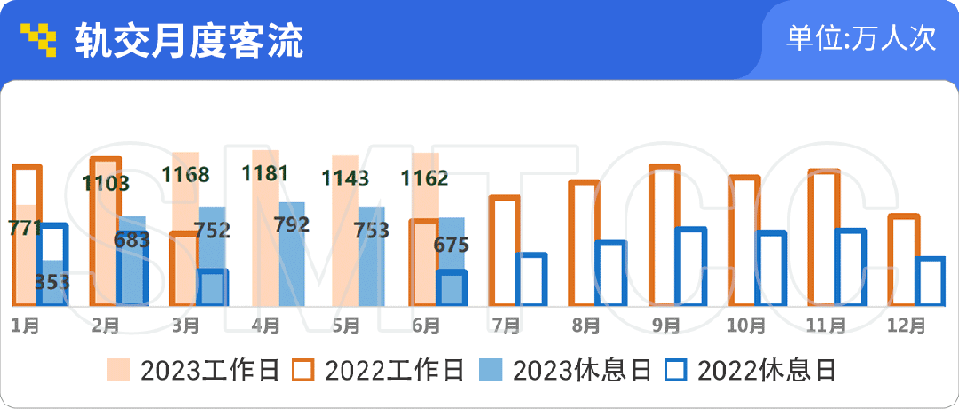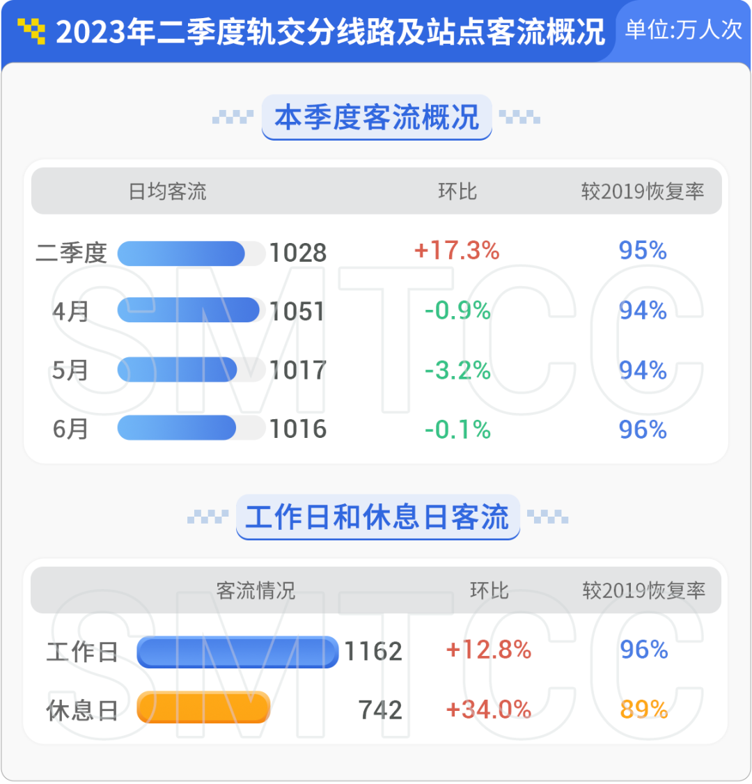 市交通委指挥中心发布《2023年上海交通运行二季度报告》(轨道交通篇),轨道交通日均客流1028万人次,环比上升17.3%,恢复至2019年95%。二季度工作日客流已恢复至1162万人次,达到2019年同期的96%,恢复率快于休息日。↓
