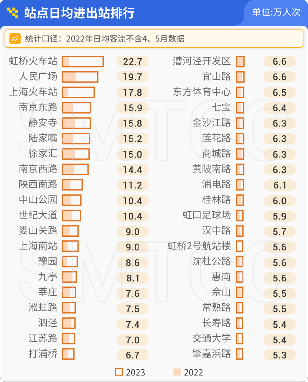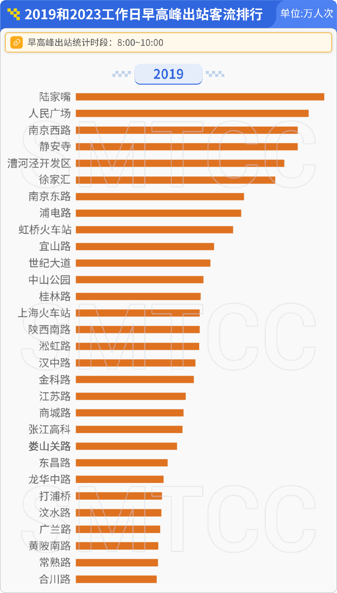 早高峰进站(7:00-9:00)客流排行较高的站点中,9号线松江段的泗泾、九亭、佘山已占据前三;曹路站客流较2019年上涨32%,位列第四;整体仍以郊区新城大居类站点为主。