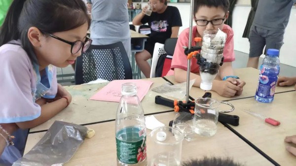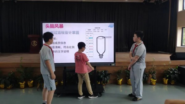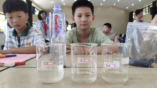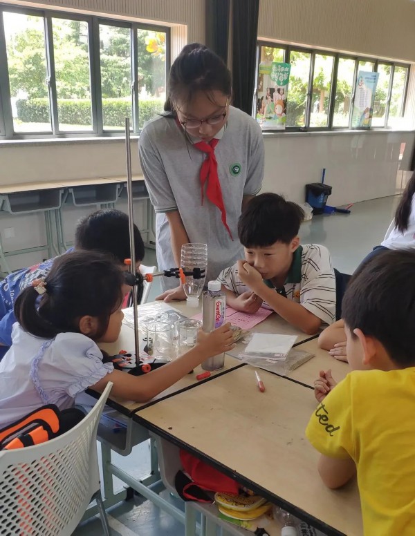 《制作过滤柱》是七(1)骄阳中队的袁梓繁、七(2)青曦中队的史佳琪和七(3)思齐中队的徐骏、王悦为暑托班小学生带来的科学探究课程,由队员自主设计、主持和组织实施。