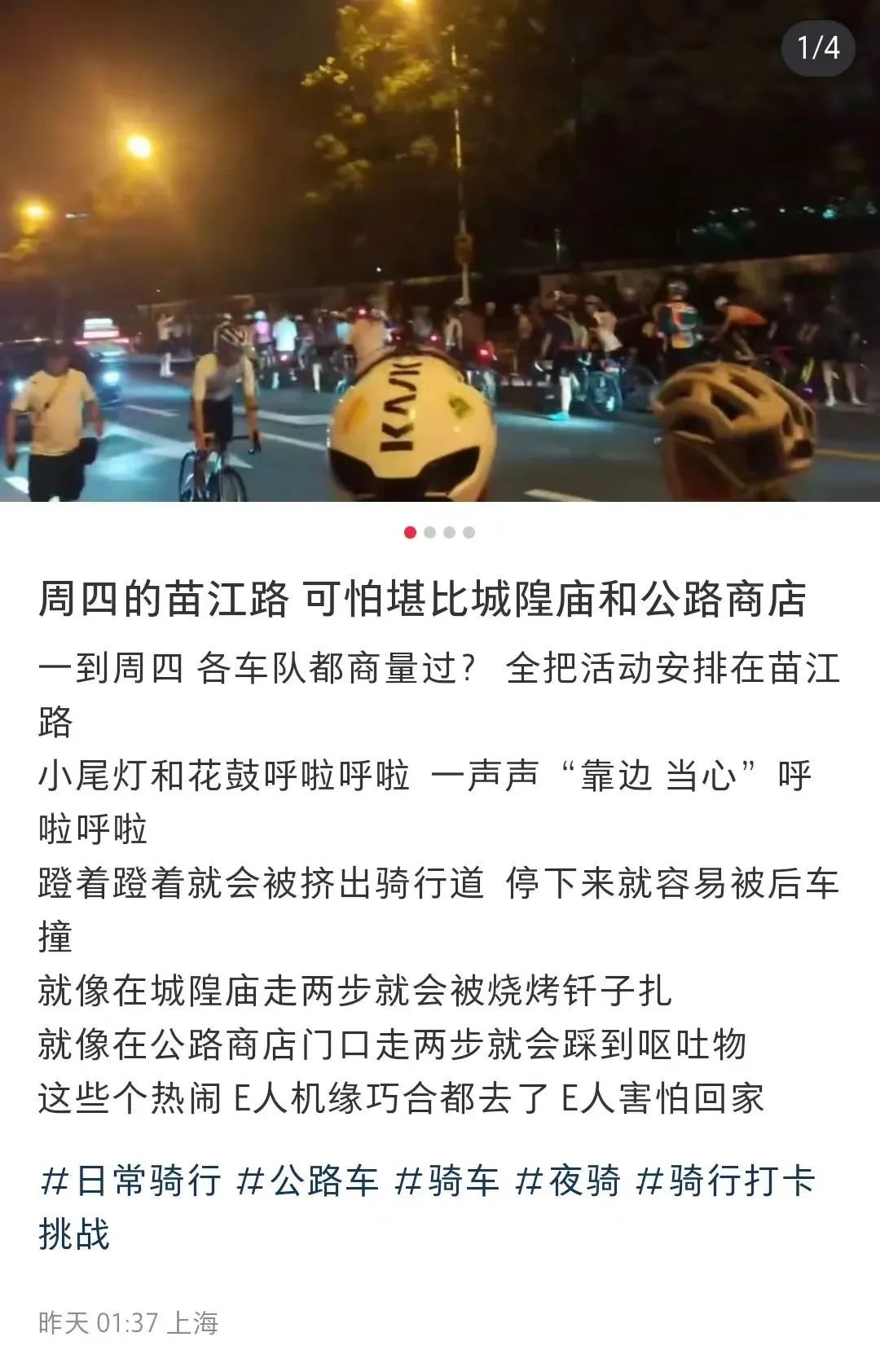 不少网友发现,每周四晚上苗江路都会约定俗成地迎来骑行大军,各个车队好像商量好一样扎堆活动,整条苗江路除了自行车就是人!
