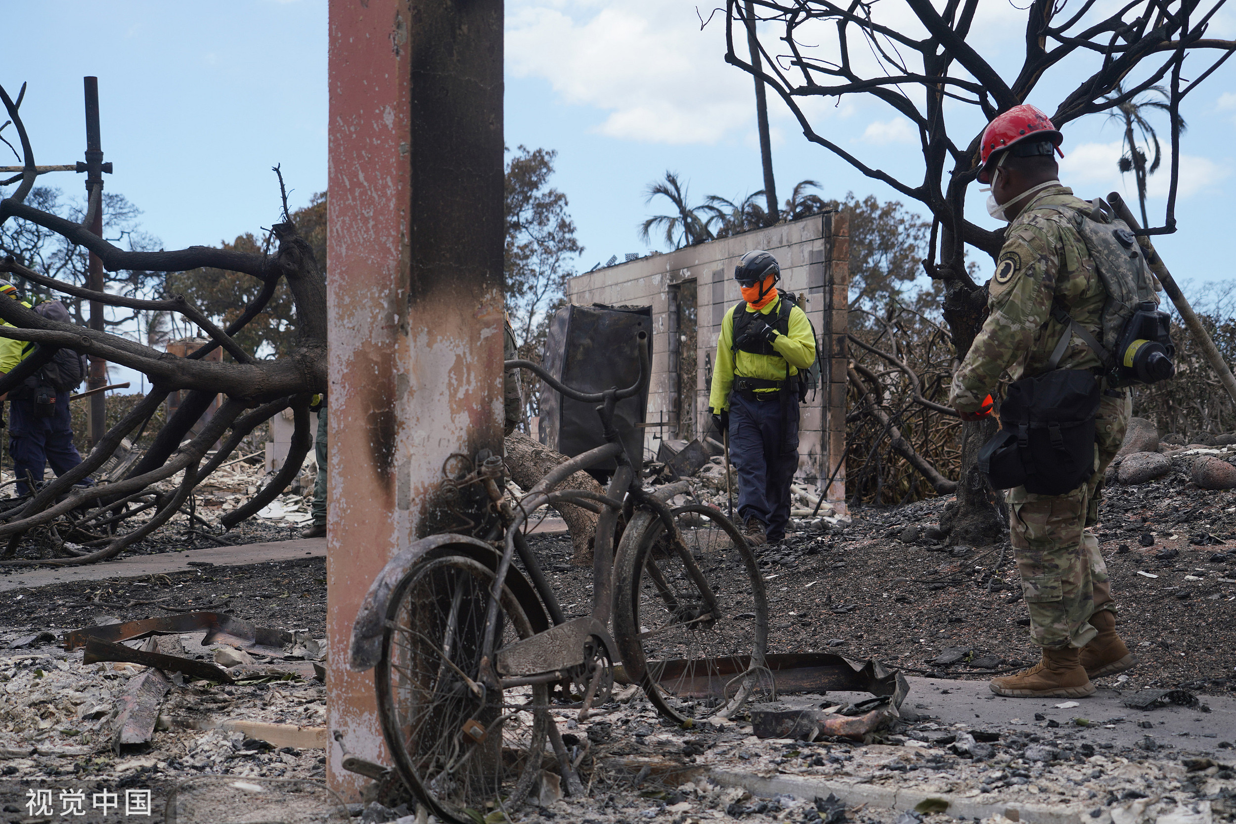 当地时间2023年8月12日,美国夏威夷州,隶属于夏威夷国民警卫队的士兵和飞行员协助毛伊县和州官员在拉海纳周围进行搜索工作。
