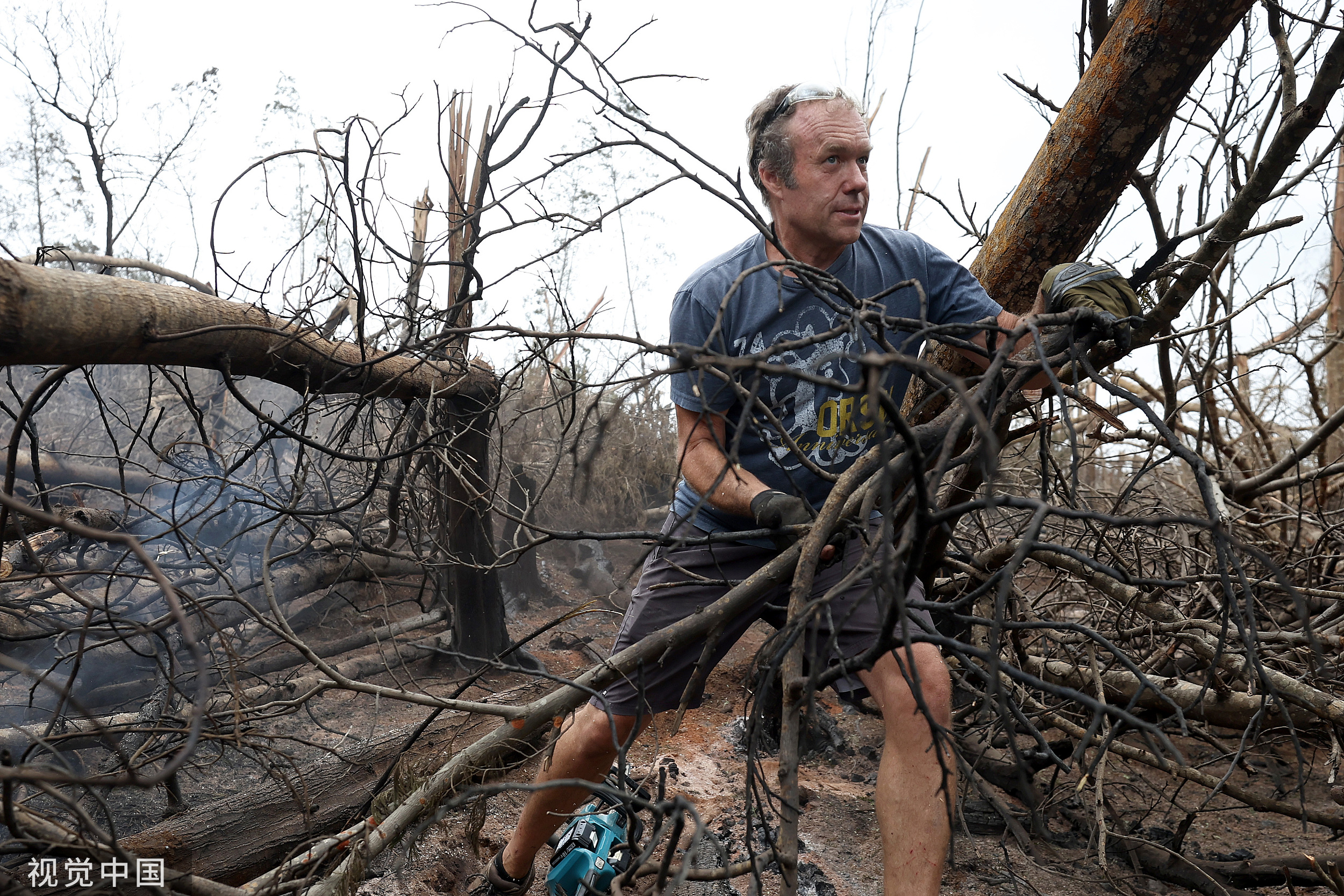 当地时间2023年8月11日,美国夏威夷,居民在库拉地区清理被野火烧毁的树木。